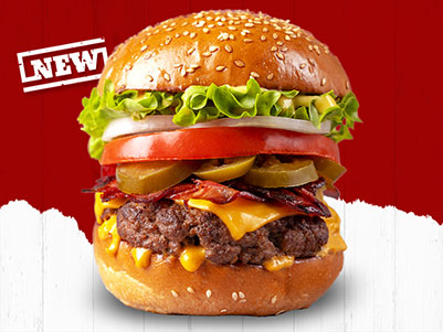 سندوتش برجر أنجوس الأمريكي الشهى مع لحم البقري المقدد، جبنه شيدر ذهبية، خس امريكى، بصل، طماطم، قطع، هالبينو لذيذه، صوص ديناميت، صوص جبن، بخبز السيزر الشهى المعد خصيصاً لكم